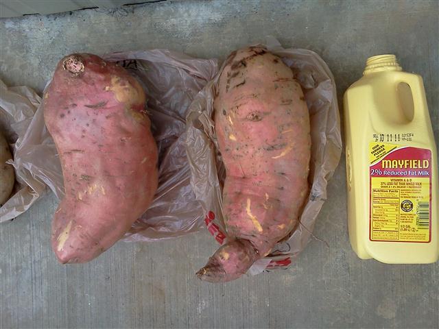 When I went to the Recycle Fire Dept that is only open on Wednesdays I saw these fabulous sweet potatoes. I had to also take a photo with the milk carton to really show how HUGE they are. Unbelievable!